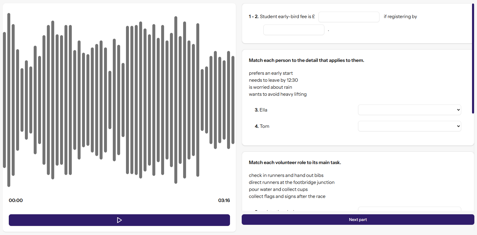 Greifen Sie auf unsere Online-Plattform zu und üben Sie jede der vier Abschnitte der IELTS-Prüfung — Listening, Reading, Writing und Speaking — einzeln und in Ihrem eigenen Tempo. Die Probetests bilden die reale Prüfungserfahrung originalgetreu nach und ermöglichen es Ihnen, Ihre Leistung zu bewerten, Ihren Fortschritt zu verfolgen und wesentlich effizienter zu lernen, wann und wo Sie möchten.